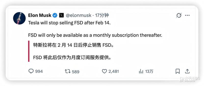此外,马斯克在不久前宣布特斯拉将于2026年2月14日后停止销售全自动驾驶(FSD)功能的“买断”服务,此后FSD将仅以“月付订阅”的形式向用户提供。此举能大幅降低用户体验门槛,扩大市场渗透率。