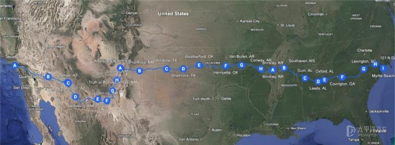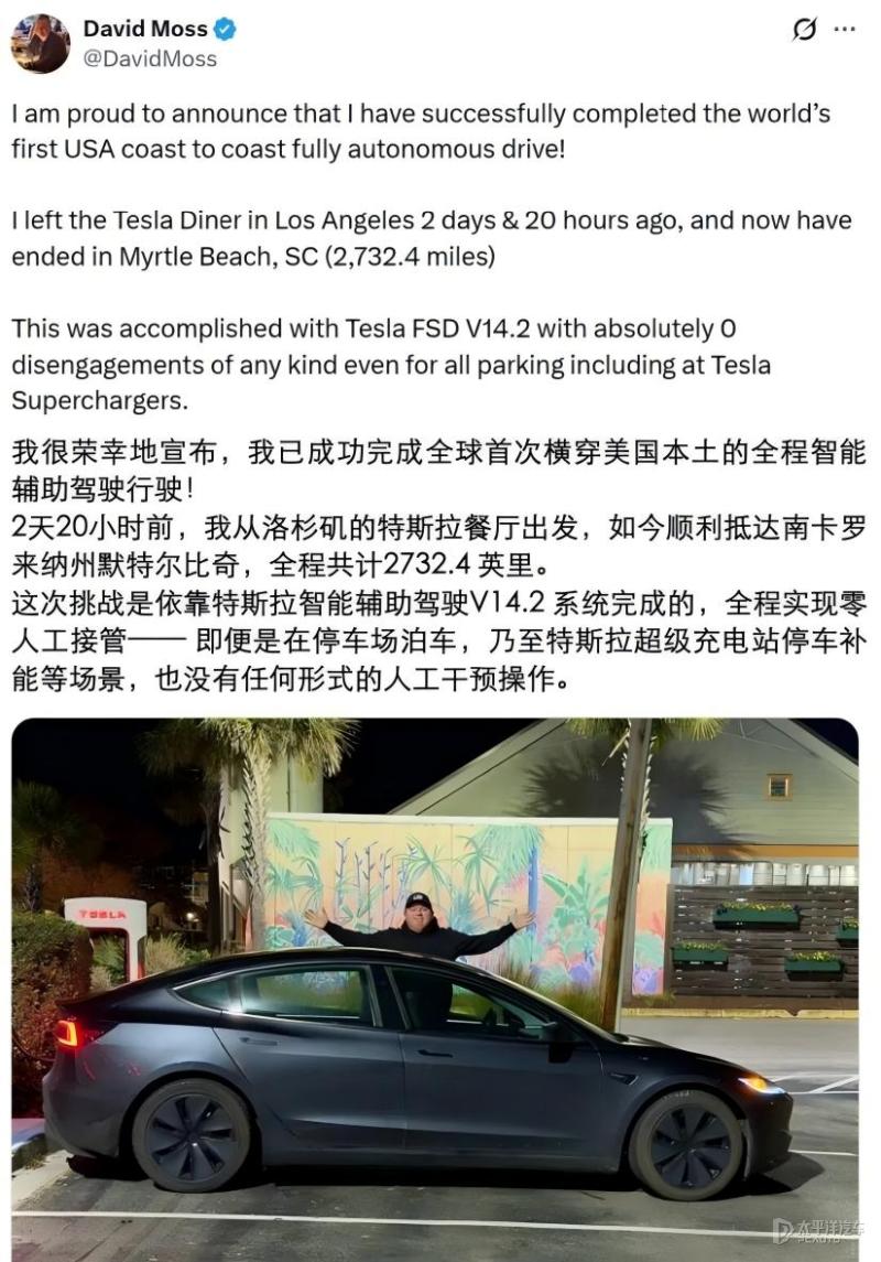 在探讨满血版FSD入华后的实际表现前,我们先来看它在北美的亮眼战绩。2025年12月,一辆搭载FSD V14.2系统的特斯拉Model 3,完成了全球首次全程零干预的横穿美国之旅:车辆从洛杉矶出发,历时2天20小时穿越24个州,全程4397公里,不仅实现了方向控制、加速制动、高速进出匝道的自主操作,甚至能在超充站自动泊车充电,全程完全自主驾驶。